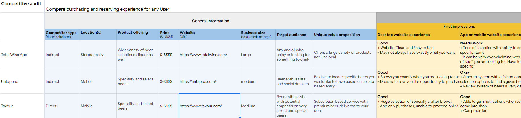 Initially, a competitive audit was conducted on several companies with apps similar to the initial focus. The audit covered aspects such as the selection process, search navigation, user flow from selection to purchase, and a general overview of how the app worked.