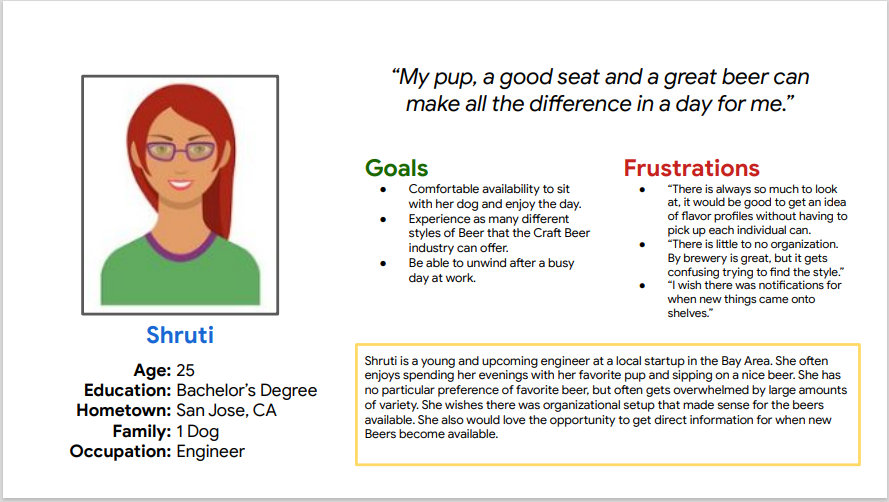 Shruti is a beer enthusiast who expressed the need for a clear and efficient way to sort and find select beers from a variety of breweries. She found sorting through each individual can be overwhelming and time-consuming. Working in the Bay Area doesn't afford her the luxury to casually travel and browse items. She would love an app that she can quickly navigate and select.